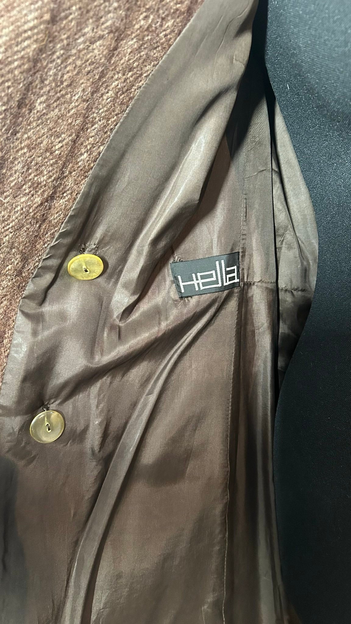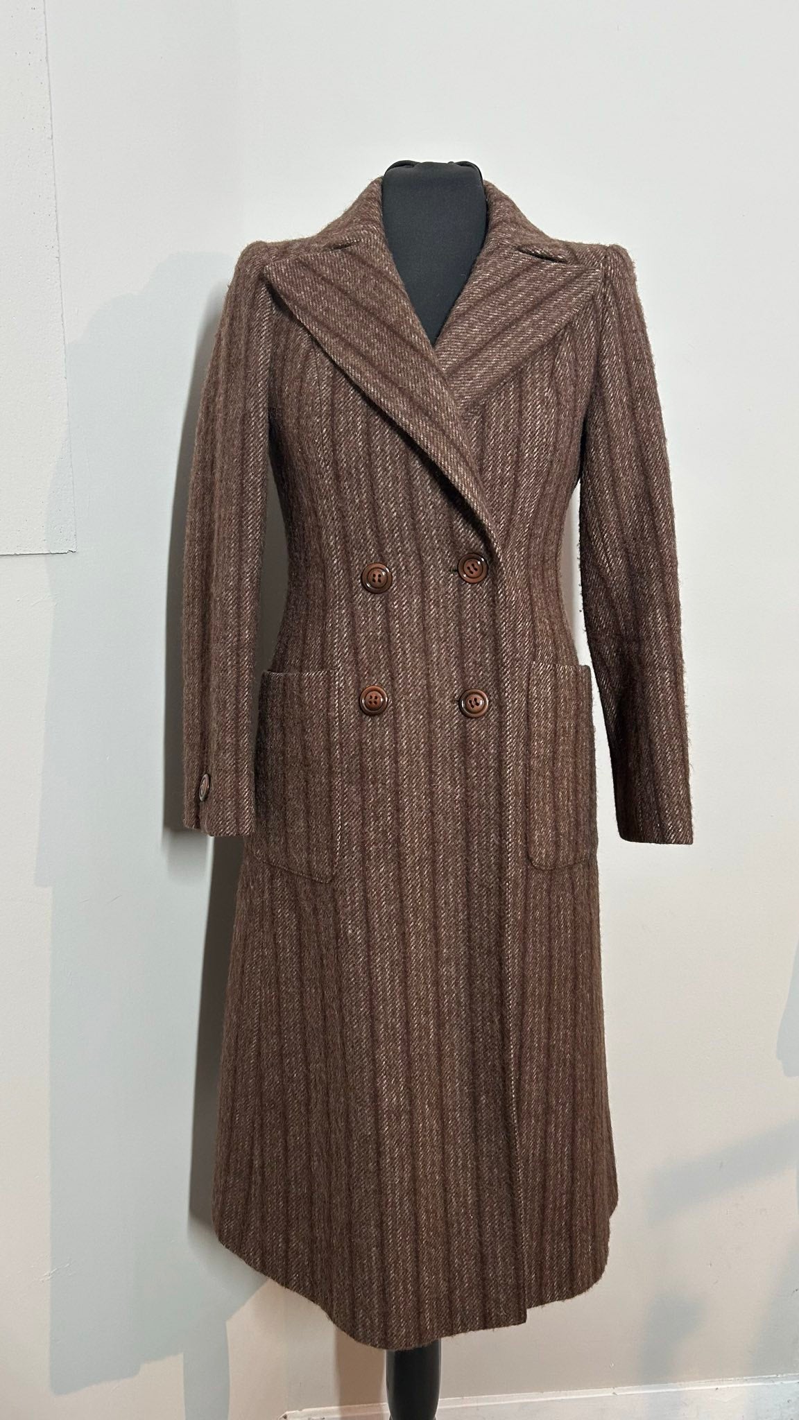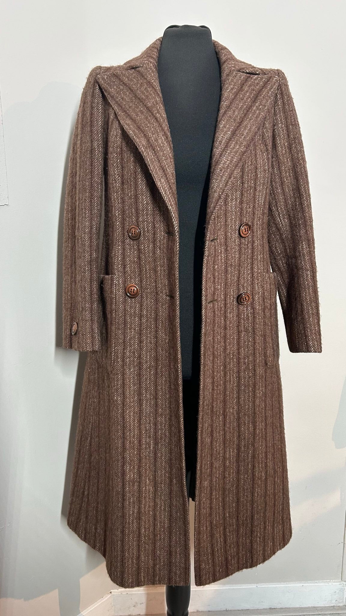 Dik geweven jas gemêleerd bruin. Prachtige kwaliteit wollen stof met originele jaren 70 kraag.